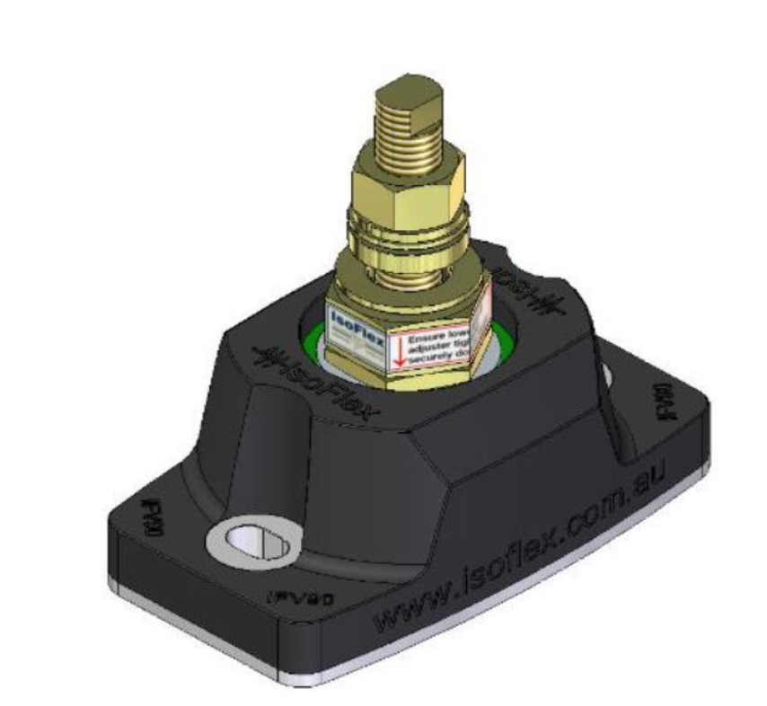 Isoflex self-aligning adjusters increase the mount's stud strength up to 3x by providing a compression fit. Adjusters allow up to 4 degrees of bracket-to-bearer misalignment to reduce point loading.
